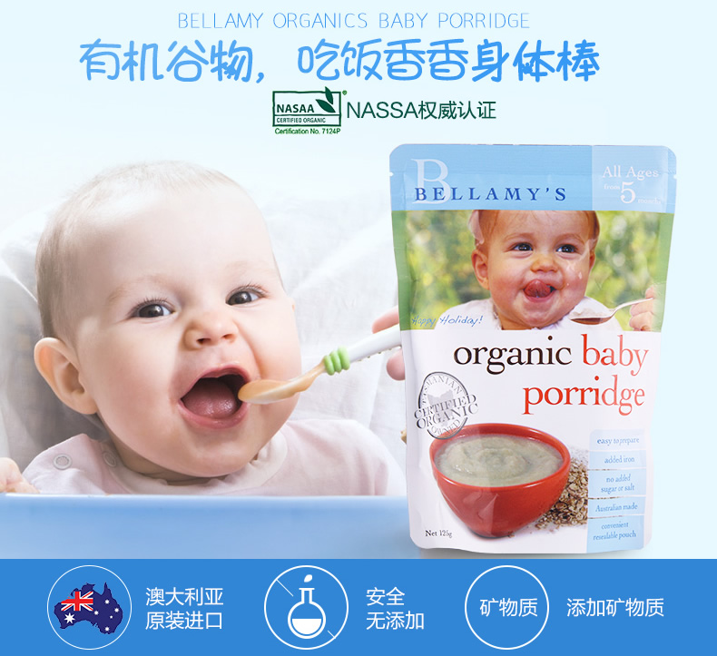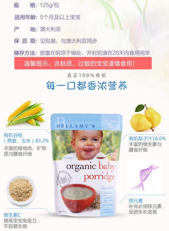 适合5个月大或以上的宝宝、特别加入铁、不添加糖或盐、澳洲制造、由NASAA权威认证、方便的密封袋包装。