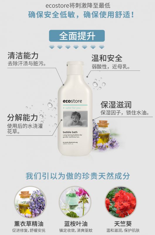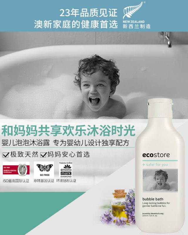 去除了所有无必要和有害的化学成分,更安全的泡泡营造一个舒心愉悦的沐浴时光。ecostore婴儿泡泡浴露给予您的宝贝更好的呵护和更多的欢乐。