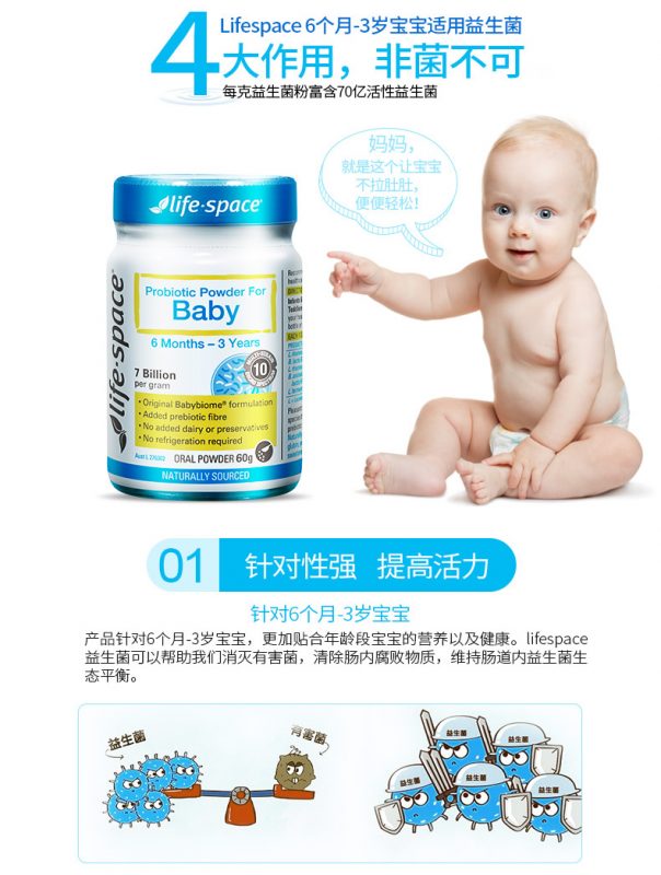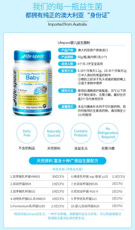 肠道细菌的发展对婴儿在出生后首3年的整体健康非常重要。Life-Space婴儿益生菌粉具有良好的细菌多样性,可支持成长中的婴儿和幼儿的最佳健康。帮助支持他们的免疫功能和胃肠健康,也可以减少婴儿在出生后的首2年发展湿疹的风险。