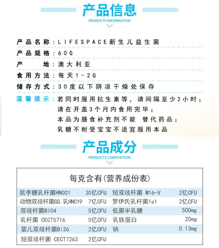 Life Space新生儿益生菌粉专门针对1-6个月的婴儿,含有多种在母乳中天然存在的益生菌,自然好吸收。同时还含有益生元和乳铁蛋白,增强宝宝体抗力的同时也有促进消化功能。