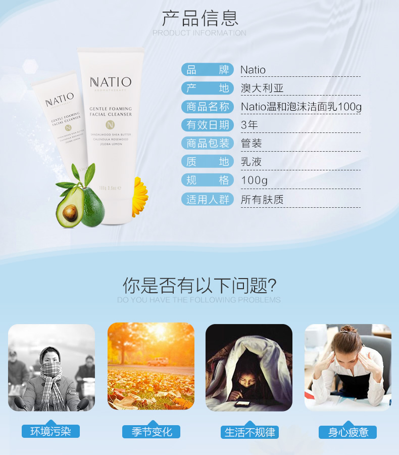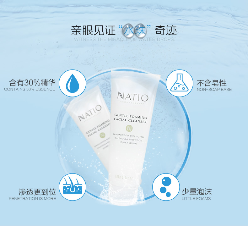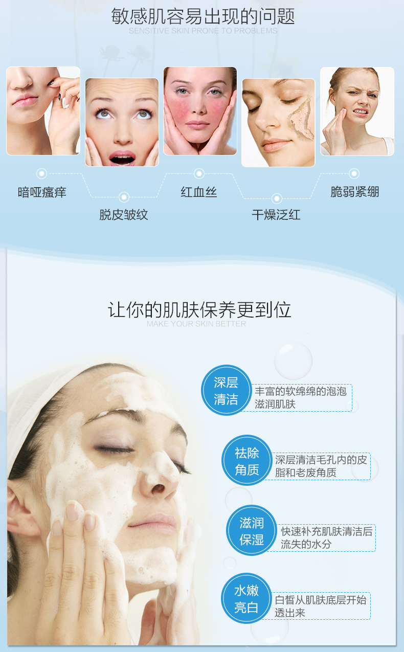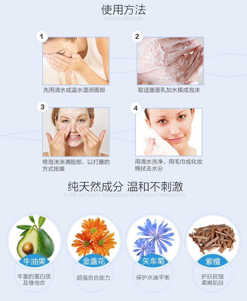 泡沫温和洁面,中性PH 值,能防止肌肤水分流失,适合所有肌肤类型。