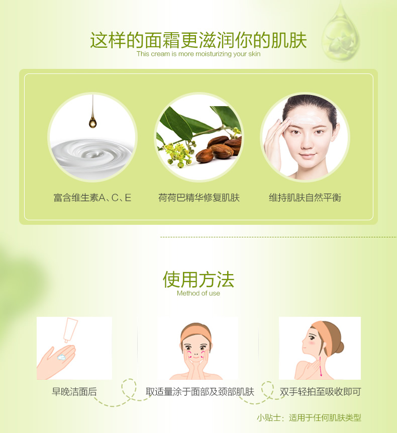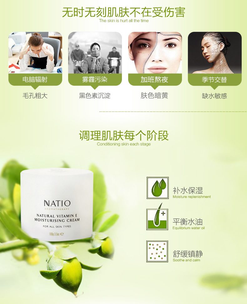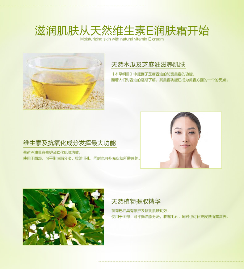 质地轻盈不油腻,富含维生素E和纯精油,能补水保湿,令肌肤柔软水嫩,焕发健康的年轻光彩。 适合所有肌肤类型。