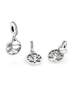 这枚手工手链吊饰以925银为原料,雕有代表家谱的家族树图案,叶片部分镶有闪亮宝石,吊饰搭配了14K金组件,并刻有“Family”字样,是Pandora以家庭和家族为题打造出的非凡杰作。